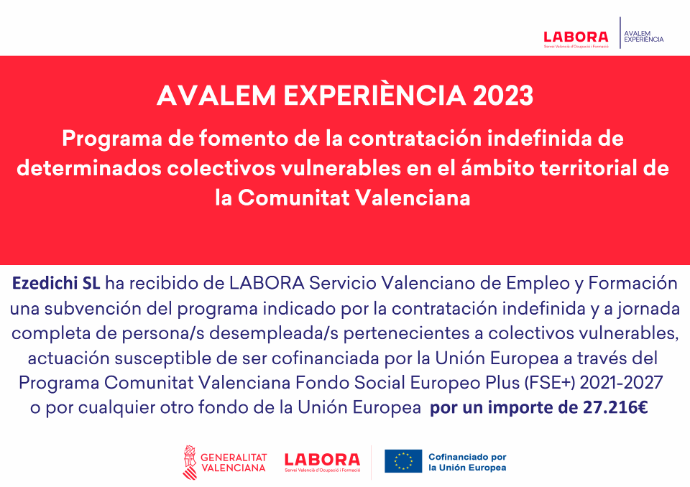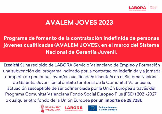 Ezedichi S.L. ha recibido ayudas del Servicio Valenciano de Empleo y Formación (LABORA) dentro de los programas Avalem Experiència 2023 y Avalem Joves 2023, destinados a fomentar la contratación indefinida de personas vulnerables y jóvenes cualificados, respectivamente.